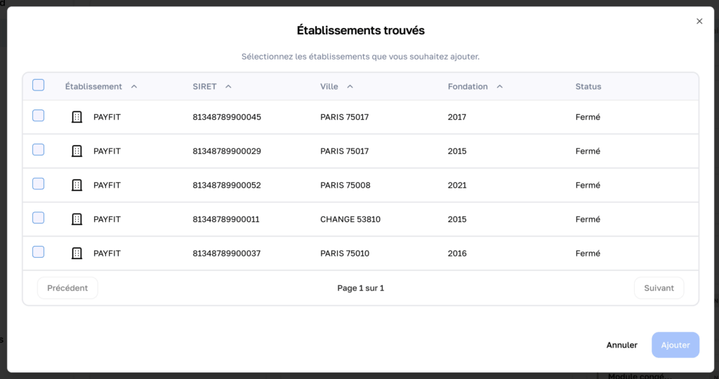 Parfois une société a des établissements reliés à elle. Vous pouvez voir les établisssements en cliuand sur l’icône bleue à droite.
