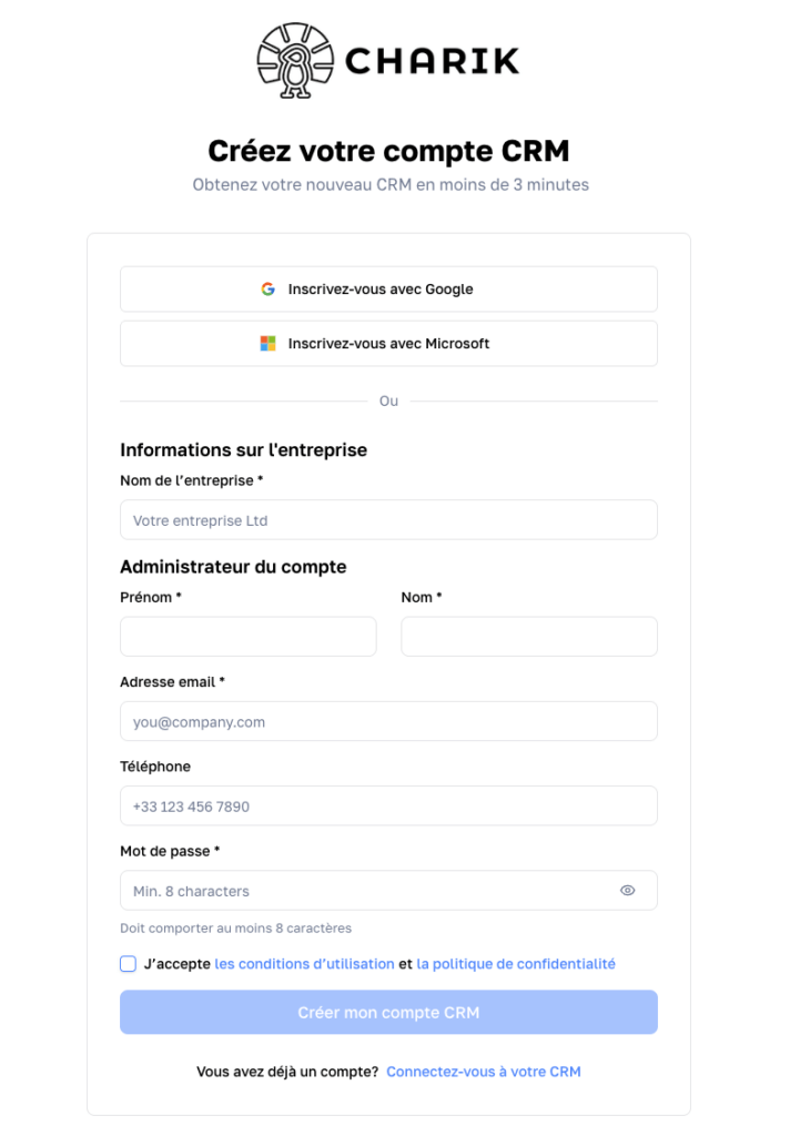 Votre compte Charik CRM sera alors créé si toutes les informations sont correctes.