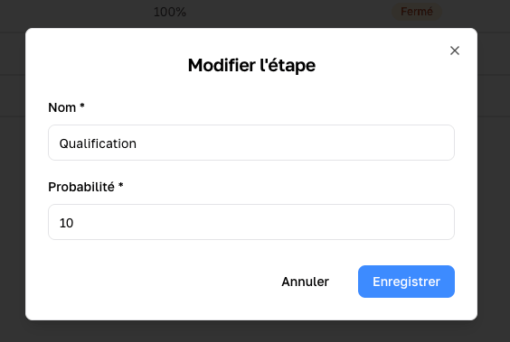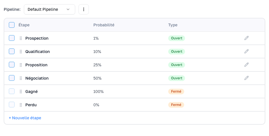 Ces étapes doivent être simples à comprendre et refléter la réalité de votre vente. Elles peuvent par exemple correspondre à :