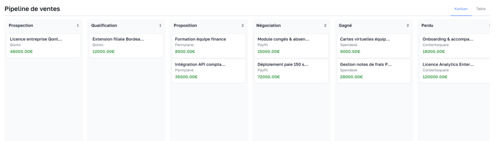 Le pipeline commercial permet de visualiser les opportunités en cours et de suivre leur progression dans votre cycle de vente.
