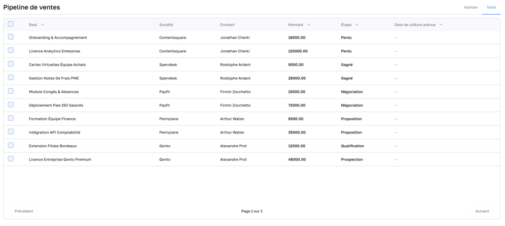 Depuis la vue liste, vous pouvez également changer l’étape d’un deal sans nécessairement ouvrir sa fiche complète. Cette option est pratique pour effectuer des mises à jour rapides, surtout lorsque vous travaillez sur plusieurs opportunités en même temps. Elle permet de gagner du temps tout en conservant une lecture structurée de vos deals.
