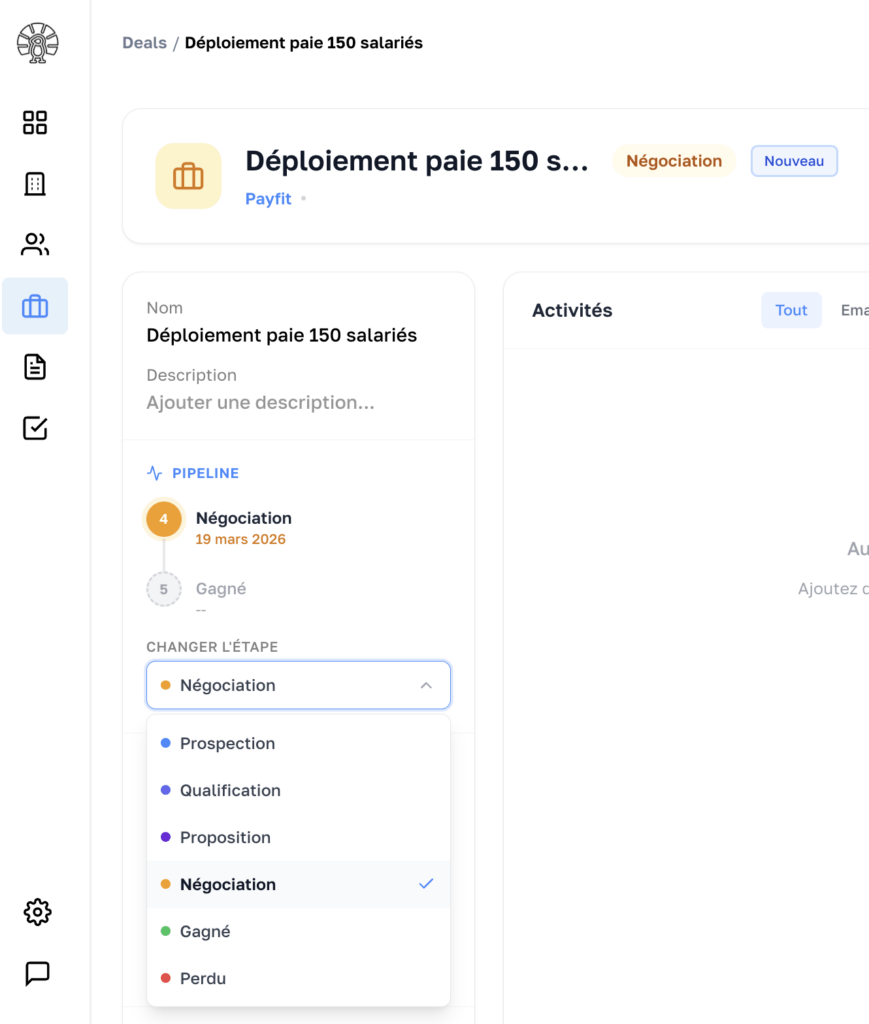 Vous pouvez enfin mettre à jour l’étape d’un deal directement depuis sa page dédiée. Cette méthode est utile lorsque vous avez besoin de consulter les détails de l’opportunité avant de la faire avancer dans le pipeline. Elle vous permet de modifier son étape tout en gardant accès à l’ensemble des informations, des notes et du contexte lié au deal.
